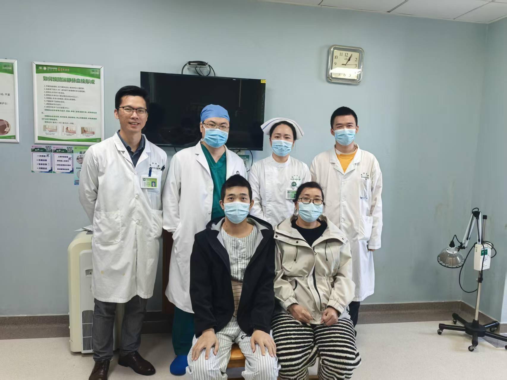 供肾离体后,于浩副教授团队立即为这颗“带瘤肾脏”精准“拆弹”,在完好保留肾实质与功能血管的前提下,彻底消除动脉瘤风险。经过专业修整的肾脏,随即被稳妥植入曾先生体内。当血管开放、血液重新充盈肾脏的瞬间,新鲜尿液缓缓滴落——移植肾成功开始工作。 得益于微创技术的优势,朱女士术后疼痛轻微,在护理团队照护下很快下床活动,恢复速度远超预期。“本以为要挨一大刀,没想到打几个孔就能救儿子,医生们真是替我们娘俩想尽了办法。”朱女士欣慰地说。